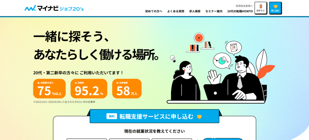 | マイナビジョブ20’s | 約5,000件 | 求人がすべて20代対象で第二新卒に特化 未経験OK求人が75%以上 |