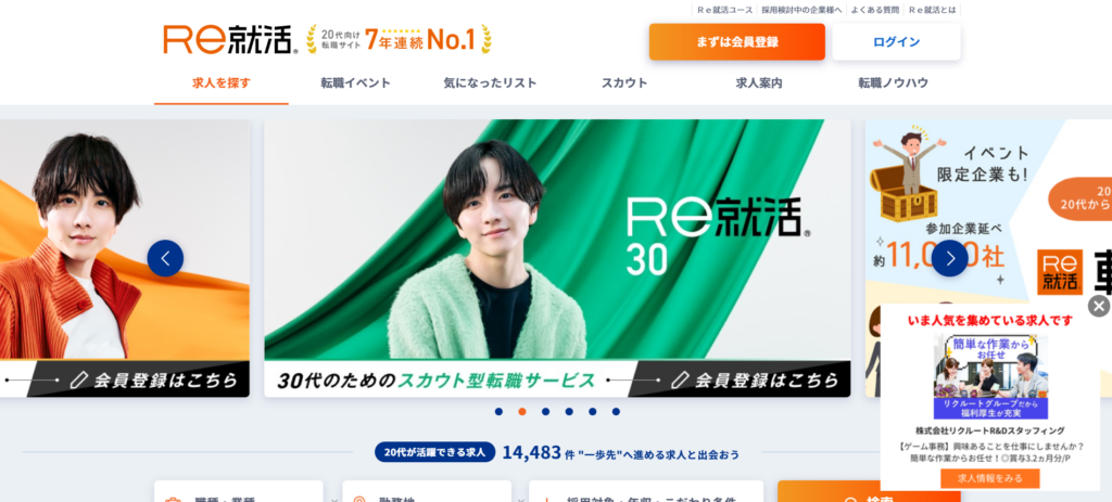 | Re就活エージェント | 約120,000件 | 20代専門、求人数が豊富(約12万件) 累計転職支援実績が約92,000人 |