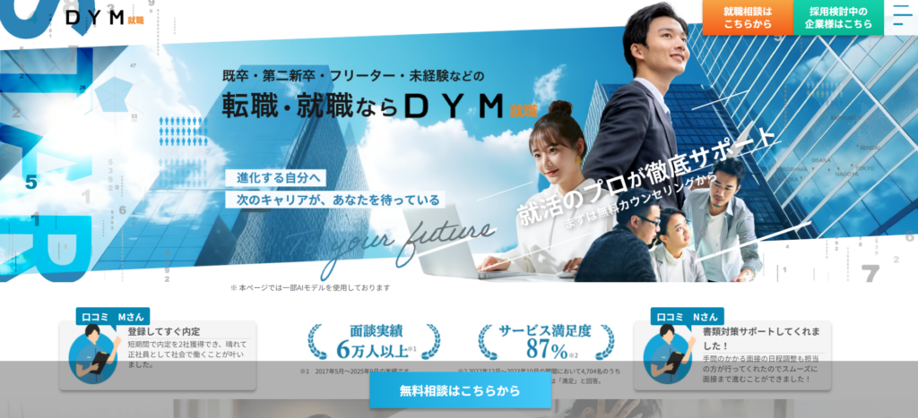 | DYM就職 | 非公開 | 書類選考スキップの面接確約求人が強み 面談実績約60,000人以上 |